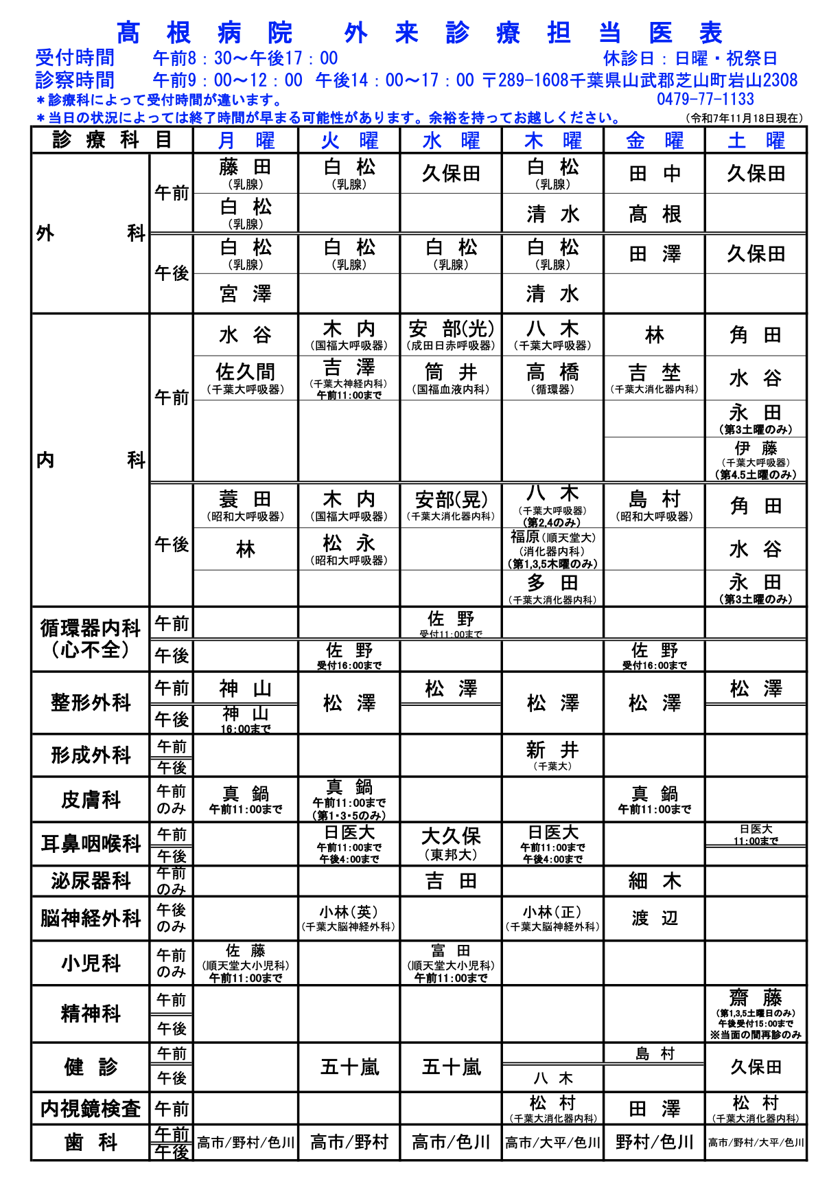 令和7年11月からの外来診療担当表